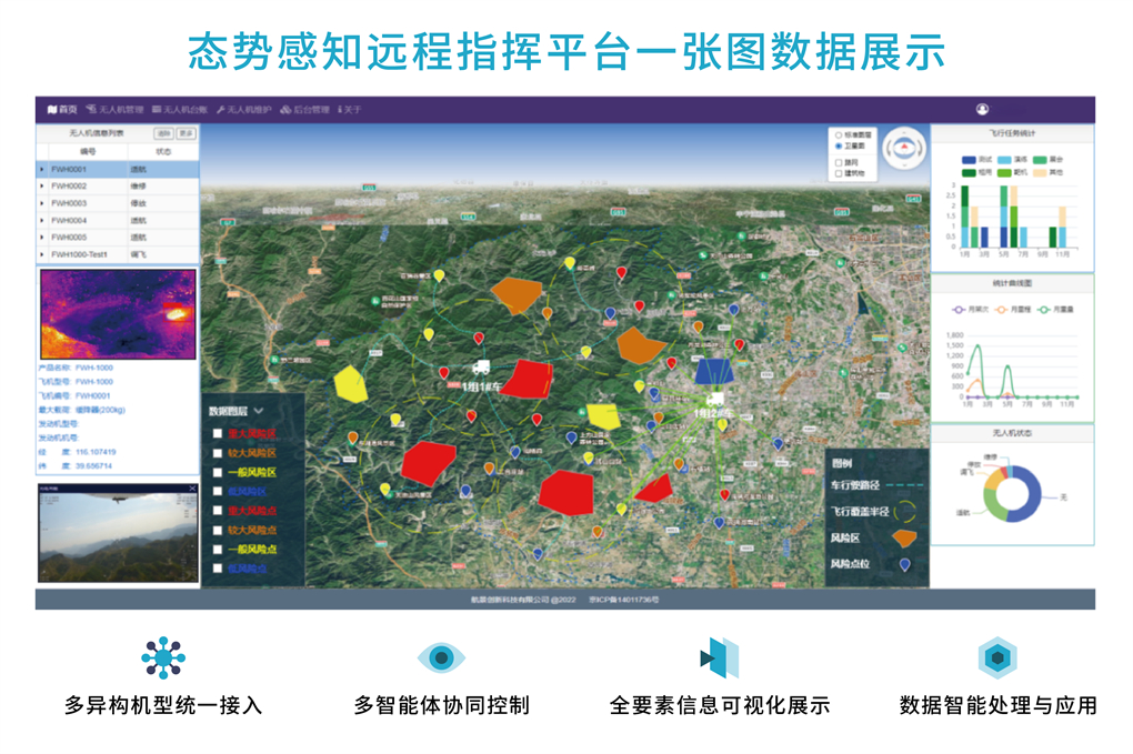 态势感知远程指挥平台融合了森林防灭火人员、无人机、地面装备、任务、数据等全要素信息的可视化展示,实现 一张图的统管与调度,基于AI数据处理引擎,实现多异构机型的集中统一控制,开展多机高效协同任务,支持接入森林 防火监控中心,为指挥联动与决策研判提供支持。