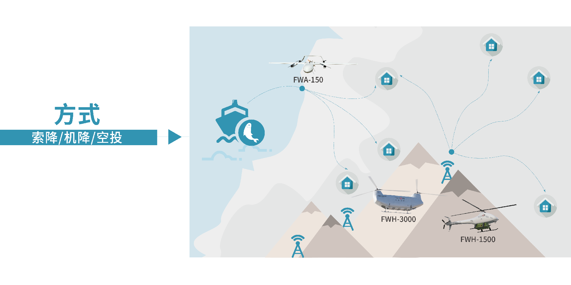 航景基于FWH-1500、FWH-3000两型无人直升机平台和FWA-150垂起固定翼无人机平台,根据货物类型和运输要求,可通过吊运、固定挂载、舱内运输等方式,结合索降、机降、空投等方式,实现物资的快速运输。