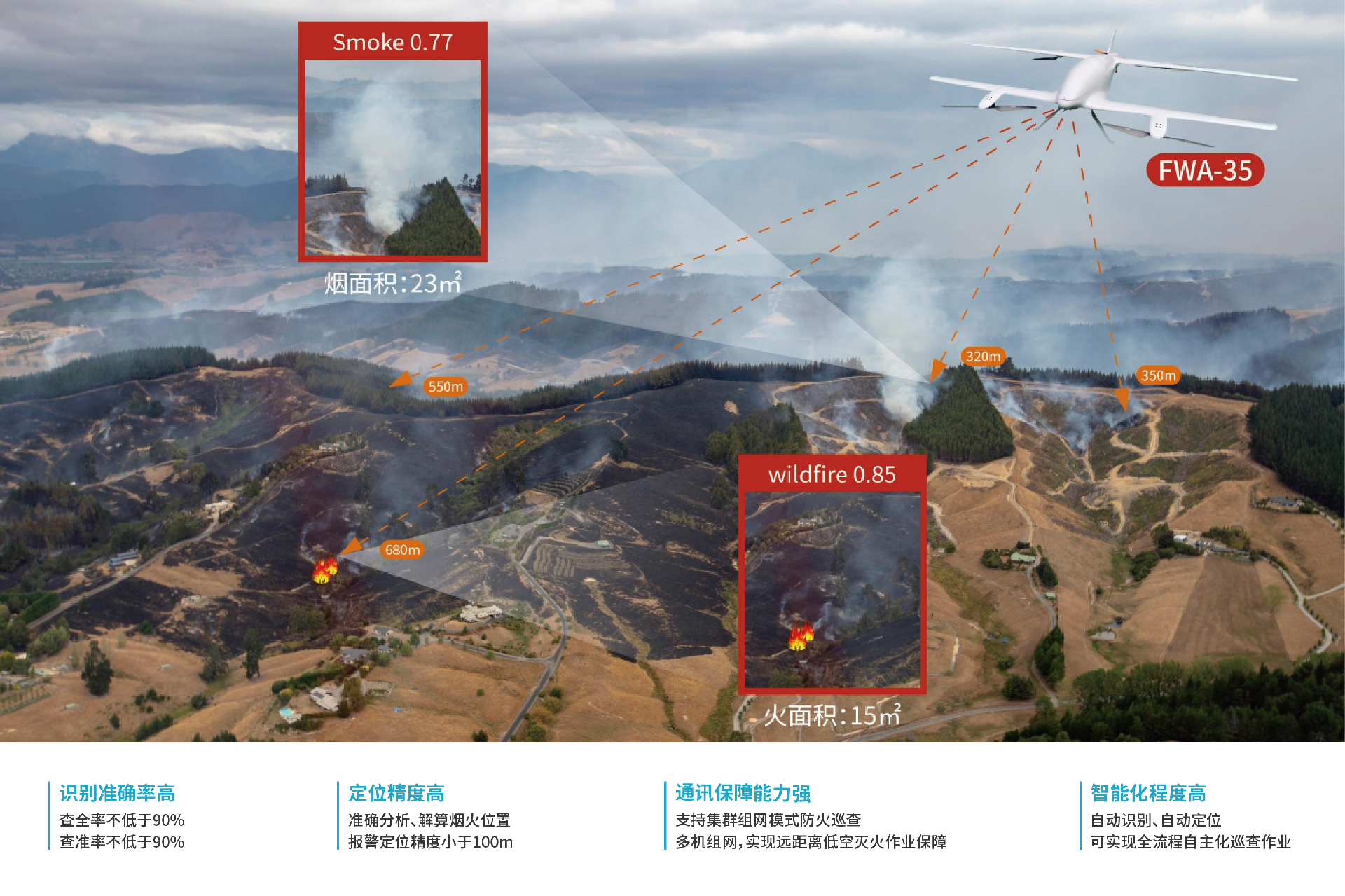 FWA-35长航时复合翼无人机滞空时间10小时。在防火季,通过远程控制执行大范围、高频次、自主化防火巡察任 务。无人机搭载三光智能吊舱对森林火灾精准识别和定位,并自动推送报警信息至森林防火监控中心,基于通讯中继模 块对前往火场执行灭火任务的多架无人直升机提供通讯保障,平战结合,彻底解决行业难题。