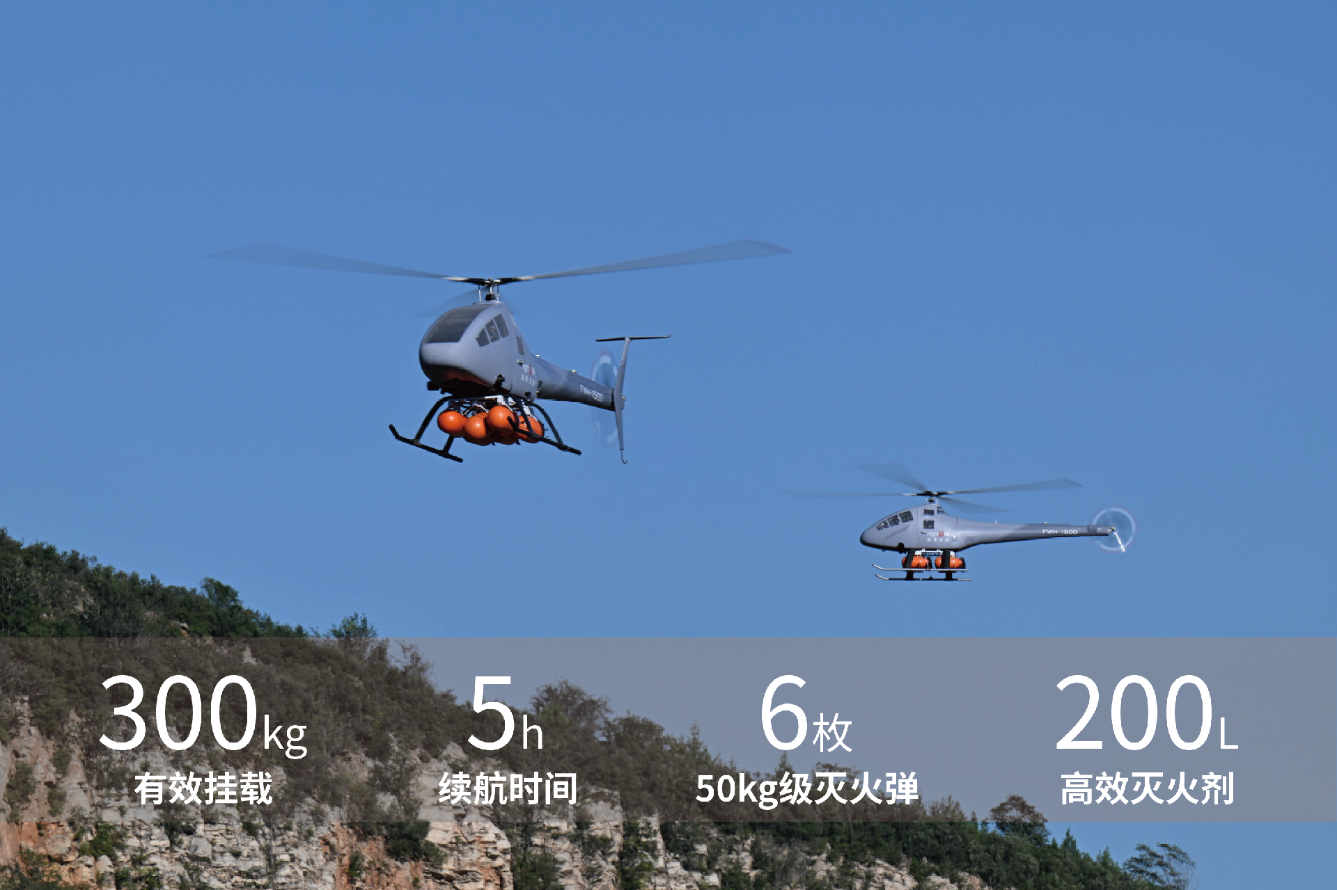 森林火灾可能发生在山崖、树冠、草丛、高压线下等复杂场景区域,单一的灭火方式或灭火材料很难应对复杂多样的火灾情况,基于多年行业实战经验,通过FWH-1500重载无人直升机平台,挂载灭火弹/高效灭火装置/灭火吊桶等,开展多机协同作业,快速实施前期森林初火打击和火势压制,并具备快速构建防火隔离带的能力,实现对森林火灾的“早处理”。